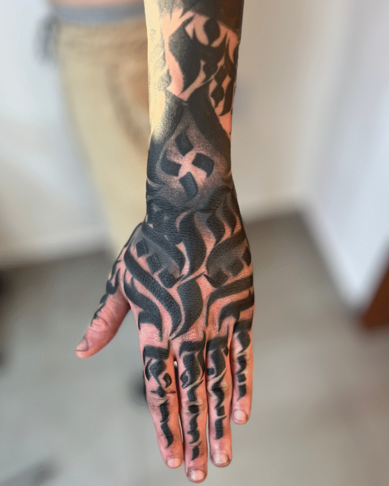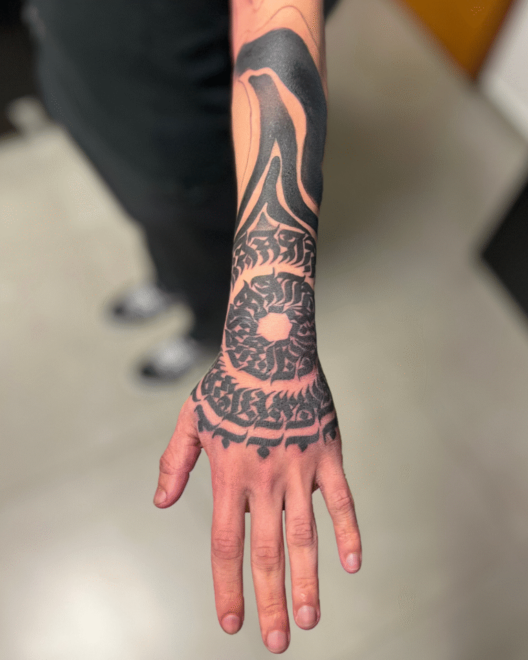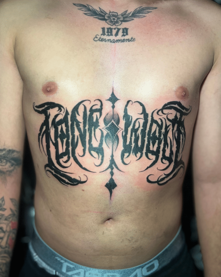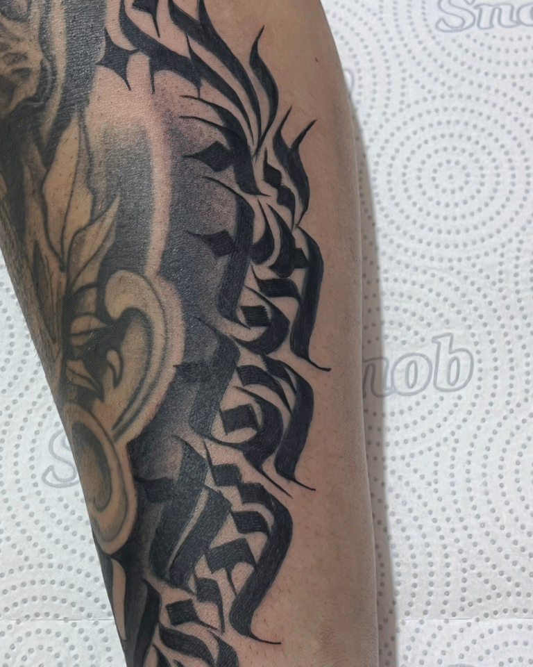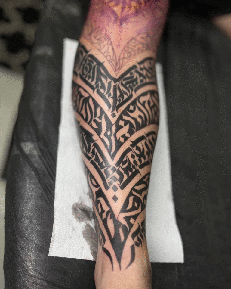 Meu estilo mistura Calligraffiti para dar exclusividade às criações, além de uma forte conexão com o Blackout e o Dark Ornamental, onde a simplicidade do pigmento acompanhando o corpo me inspira profundamente.