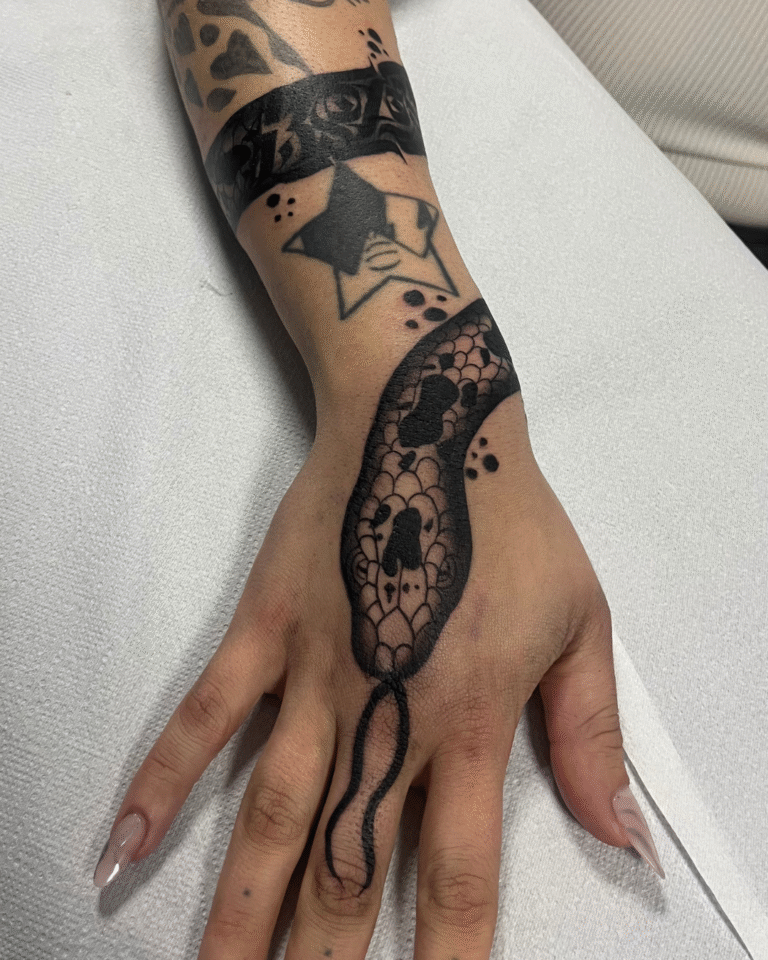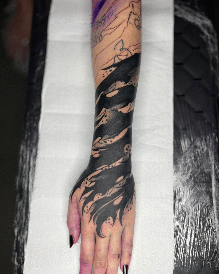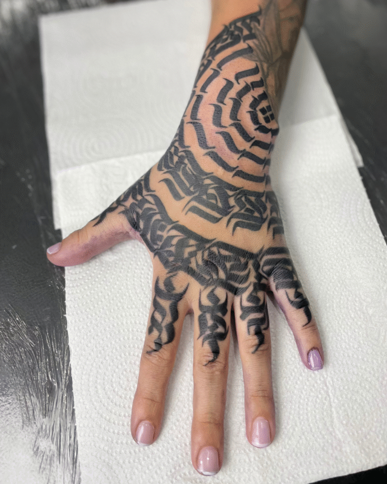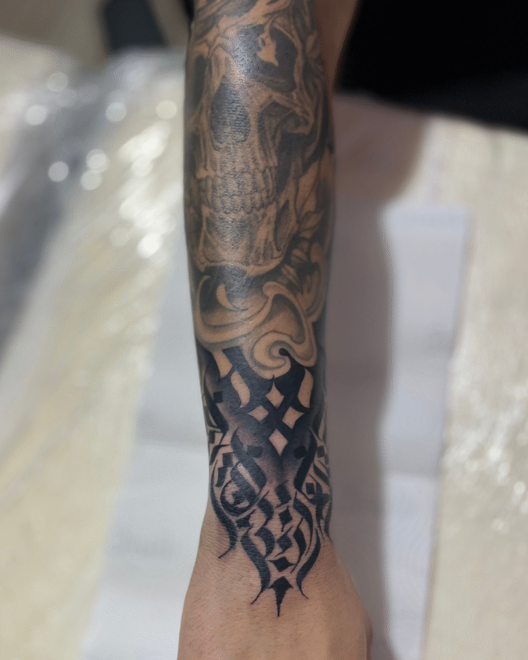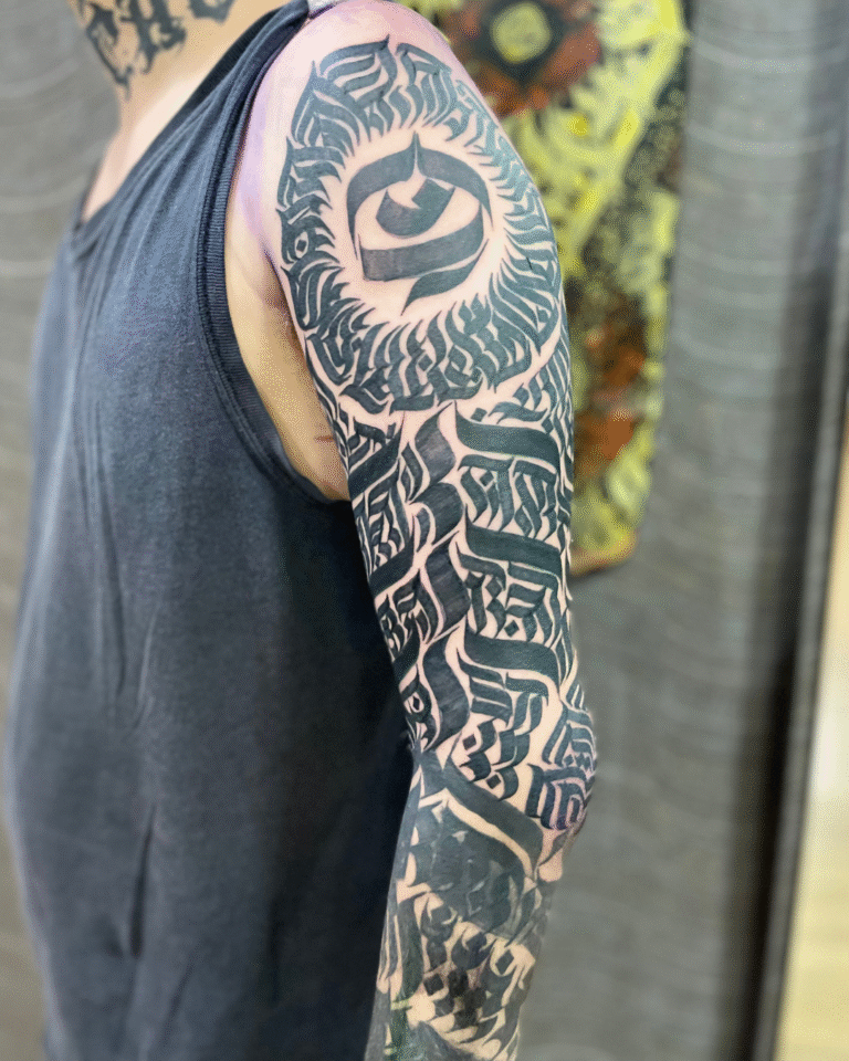 Meu estilo mistura Calligraffiti para dar exclusividade às criações, além de uma forte conexão com o Blackout e o Dark Ornamental, onde a simplicidade do pigmento acompanhando o corpo me inspira profundamente.