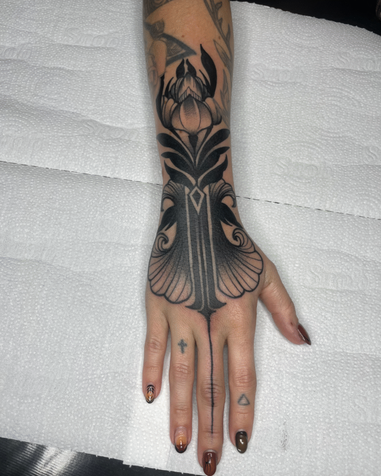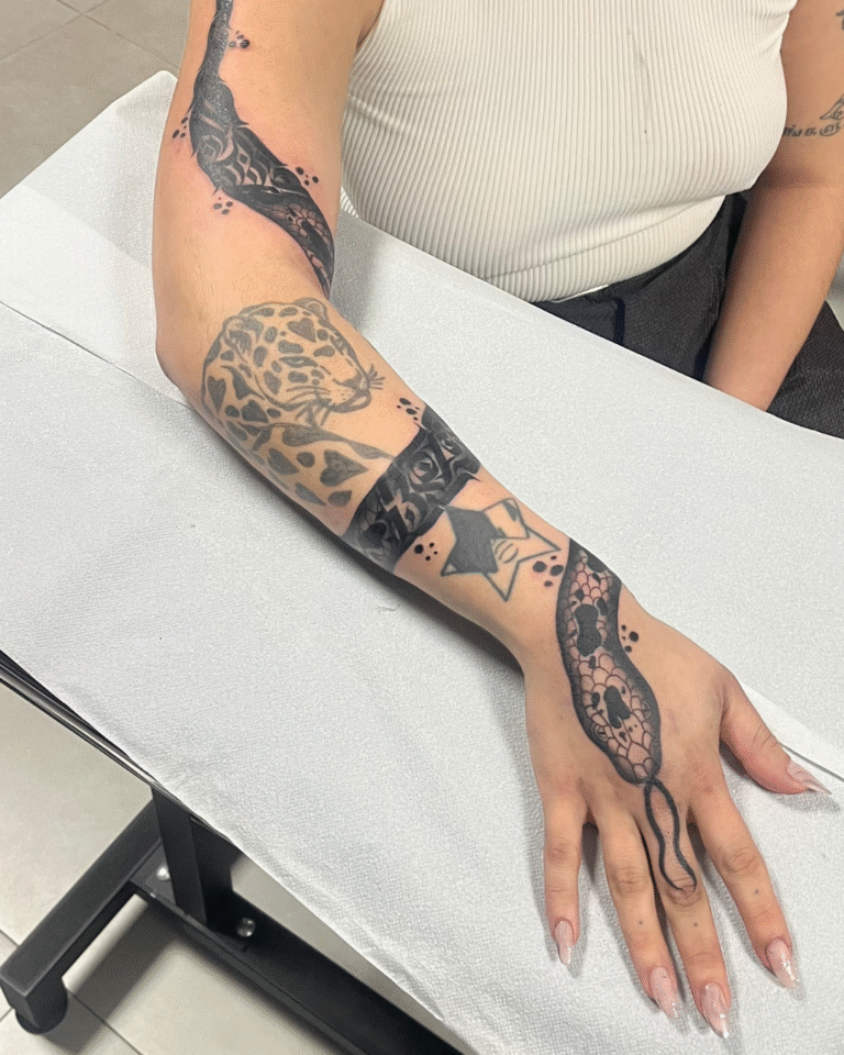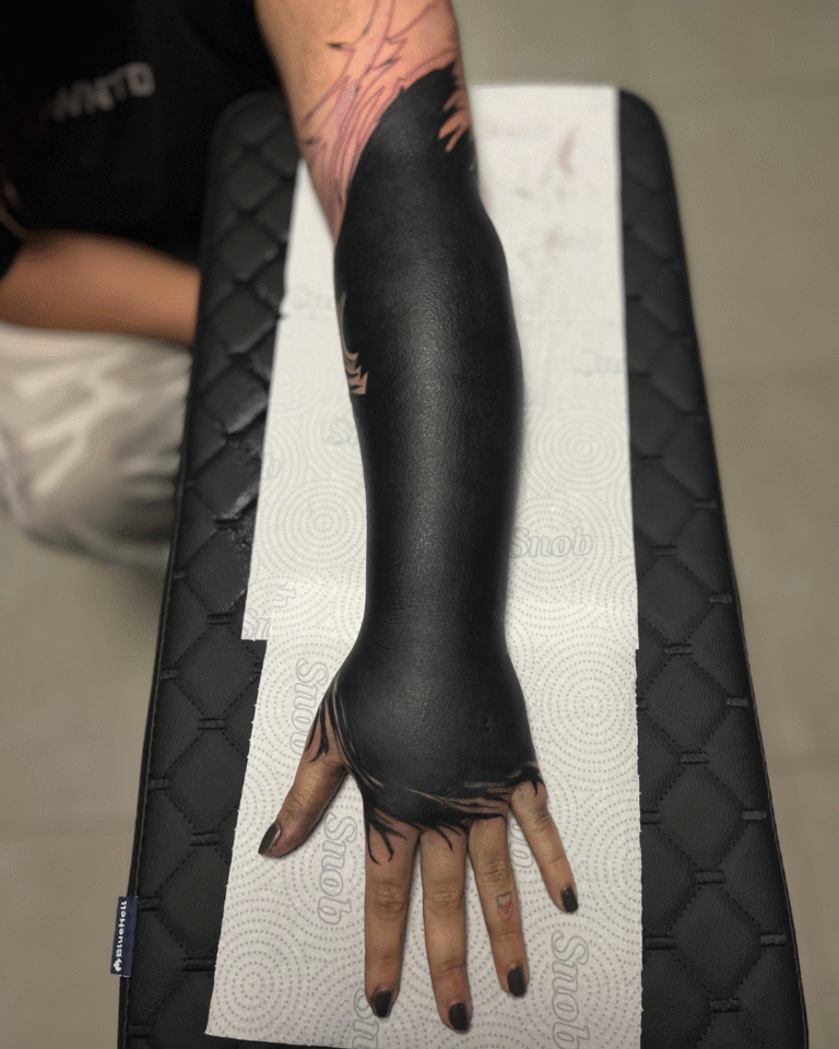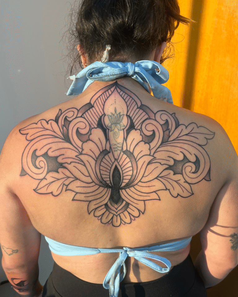 Trabalho cada tatuagem junto com o cliente, utilizando a técnica de Free Hand para desenhar diretamente no corpo, criando harmonia com a anatomia e proporcionando uma experiência única, calma e focada nas ideias do cliente.